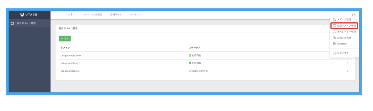 UTAGEの右上の契約者名を選択し、独自ドメインを選択してログインします。