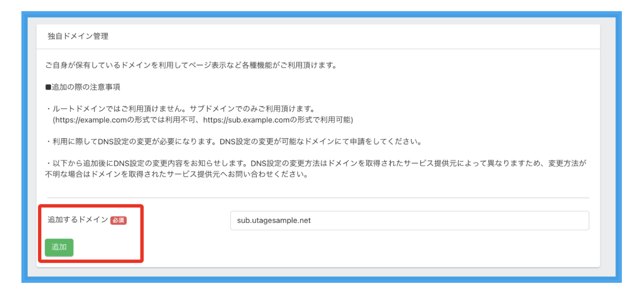UTAGEではルートドメインは使えないので、必ずサブドメイン形式で設定してください。