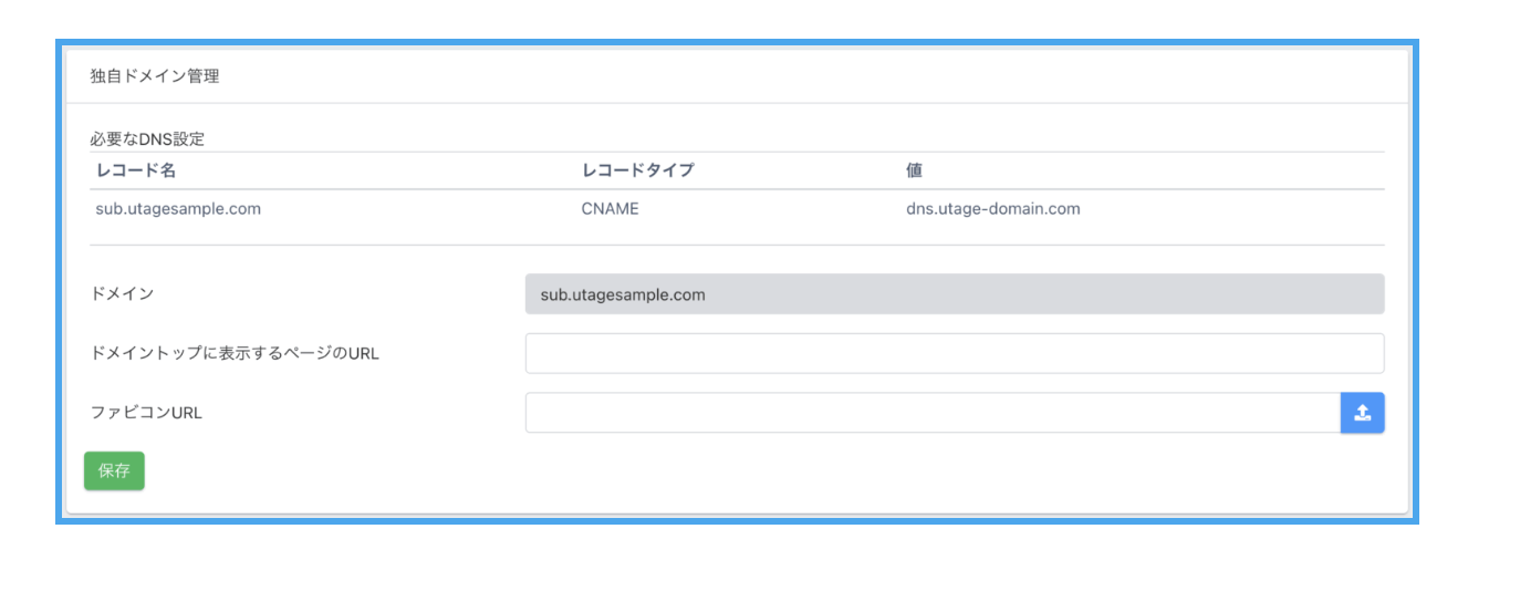 作成したサブドメインをUTAGEに登録するとCNAMEレコードが発行されます。
